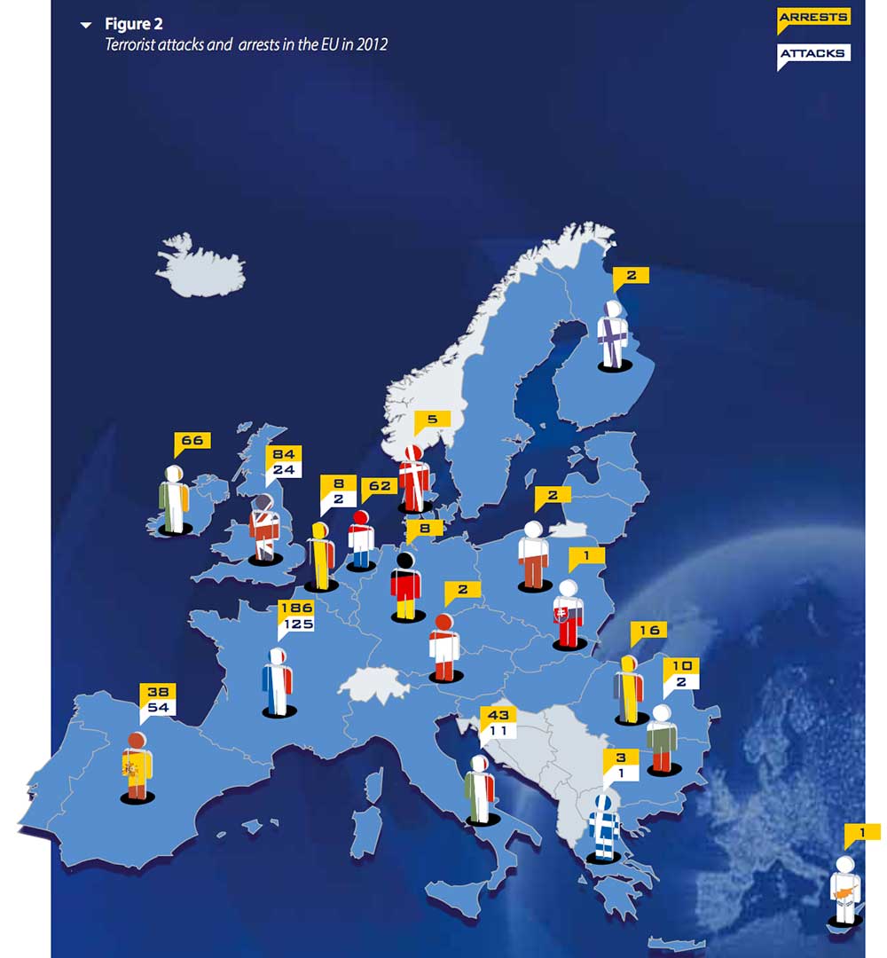 En åskådlig bild över arresteringar och attacker i EU – Europol 2012 (pdf).