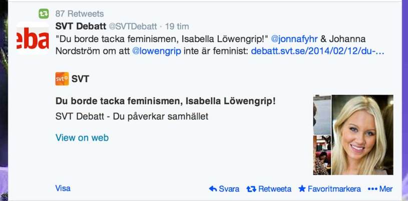 Isabella vad du än gör så tacka INTE feminismen! Möjligen kommentera hur du uttryckte dig om feminister eftersom det finns så många som inte ser det humoristiska i detta känsliga.