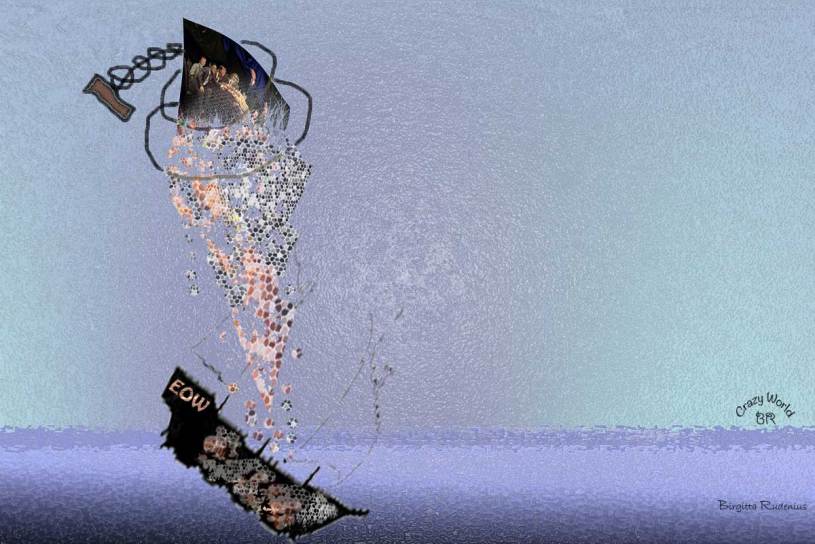 Elisabeth Ohlson Wallins tavla ”Pizzabuffén” mals ner och det malda flyter ner i ett skepp som sjunker. Havet är stilla. Tavlan försvinner i djupet.