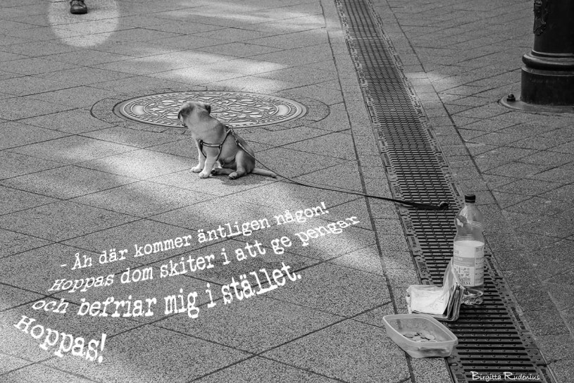 Så här kan man också bedriva tiggeri. Man binder en bedårande valp på ett flödande shoppingstråk. Placerar en ask med några slantar. Skriver en skylt ”HELP”. Flyter sedan själv runt bland de passerande och håller koll på pengarna som läggs i asken.