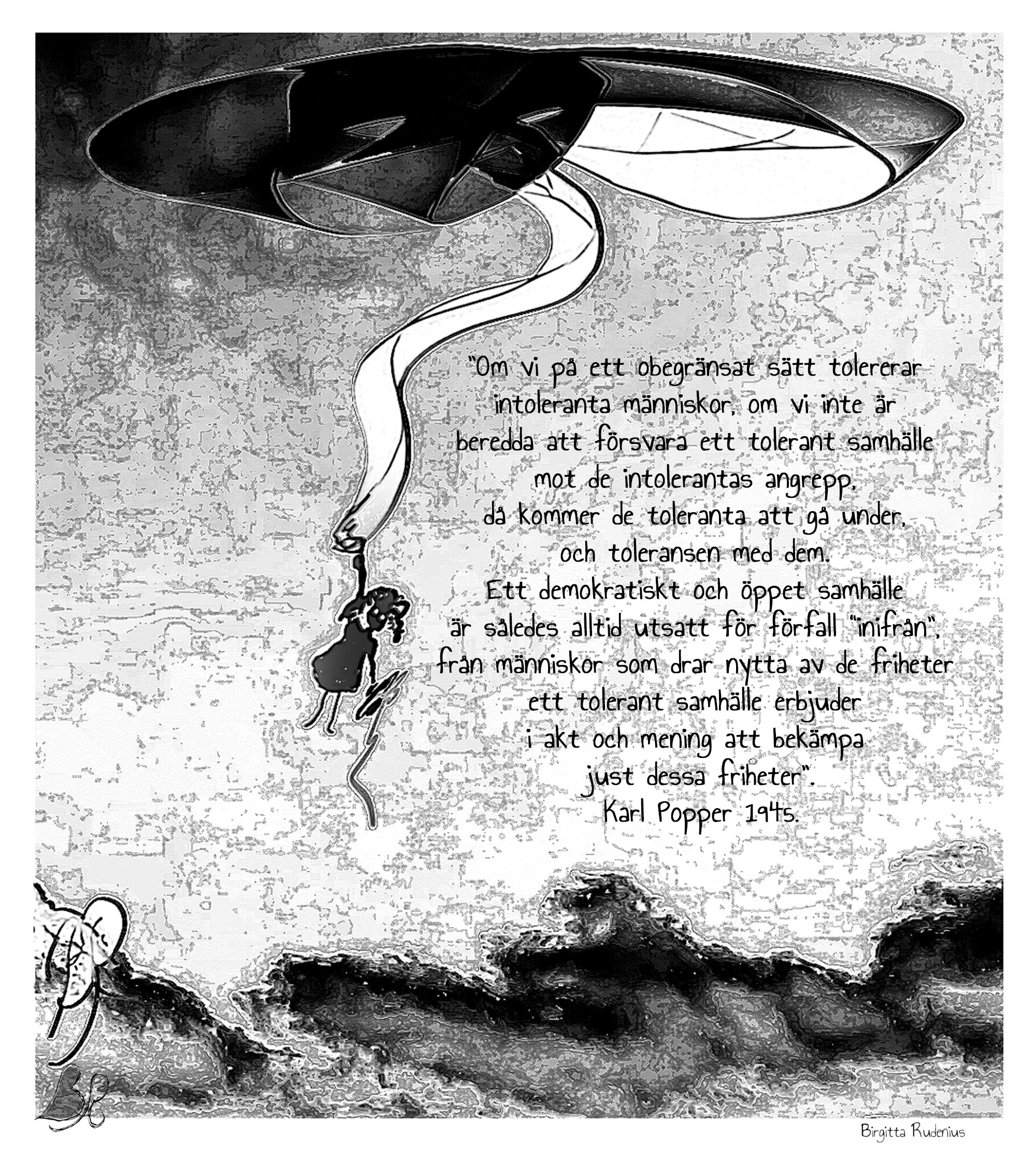 ”Om vi på ett obegränsat sätt tolererar intoleranta människor, om vi inte är beredda att försvara ett tolerant samhälle mot de intolerantas angrepp, då kommer de toleranta att gå under, och toleransen med dem. Ett demokratiskt och öppet samhälle är således alltid utsatt för förfall ”inifrån”, från människor som drar nytta av de friheter ett tolerant samhälle erbjuder i akt och mening att bekämpa just dessa friheter”. Karl Popper 1945.