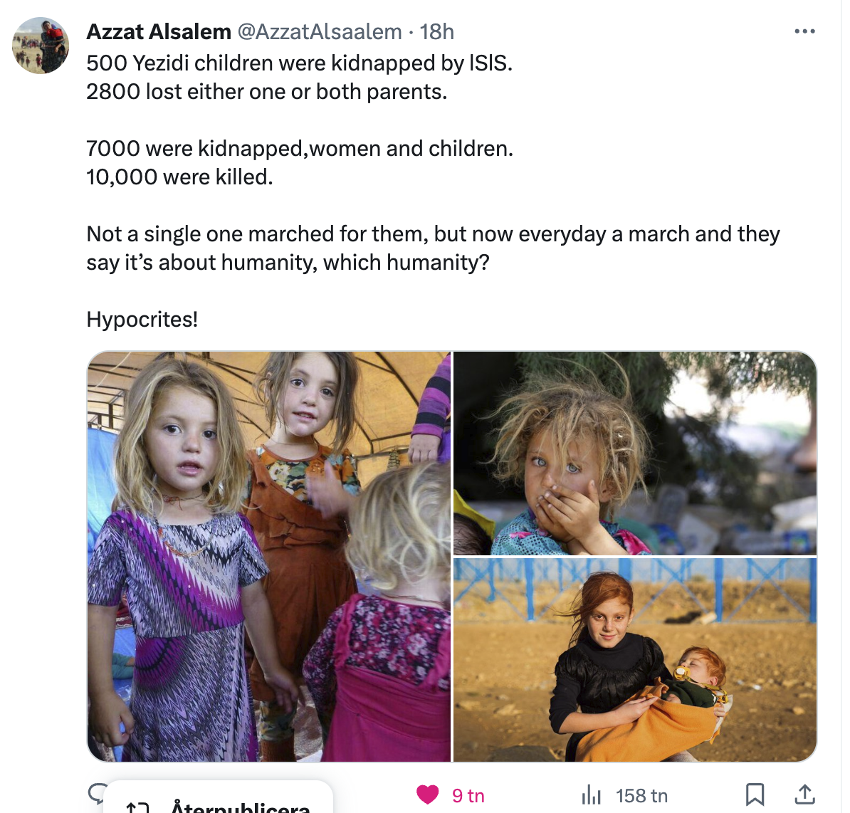 Ock vänsterfeministerna ska vi inte tala om. De gapar och skriker i tågen som supportar Hamas – tjänar som nyttiga idioter för terrorister som förtrycker. Både de egna och är samtidigt omänskliga i sin syn på alla andra – särskilt kvinnor – som inte är muslimska. Vilka svikare dessa vänsterfeminister är!!!